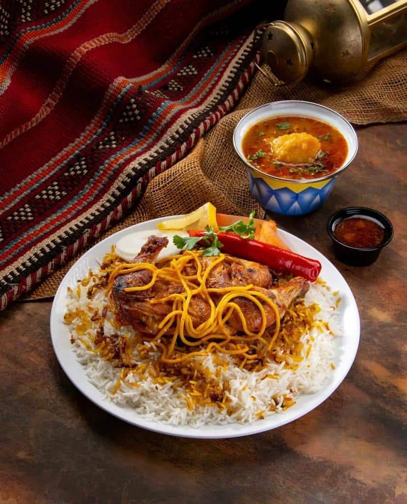 نصف دجاجة مجبوس مع الرز النثري يقدم مع مرق الخضروات ومعبوج والسيرفس